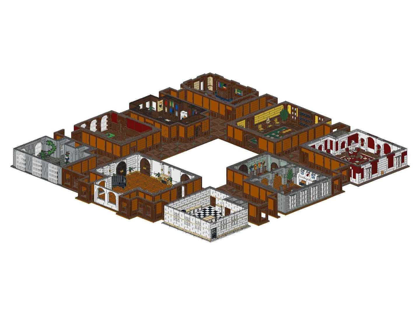 Presently, I am building each room in MLCad 3.5, which I highly recommend. Once each room is built, I will start purchasing the necessary pieces to begin assembly. I start by building just the room itself, then flesh out the surrounding playing spaces, then add furniture. Each of the nine rooms and center staircase are designed and built separately so that they can be dealt with as separate sets which can lock together (similar to what Lego does now with sets). Each room has been built, except for the central staircase, in MLCad and I am currently picking through the models to work out any kinks and to start adding the mechanisms which will lock them together. At present, the full board contains 15,211 pieces.